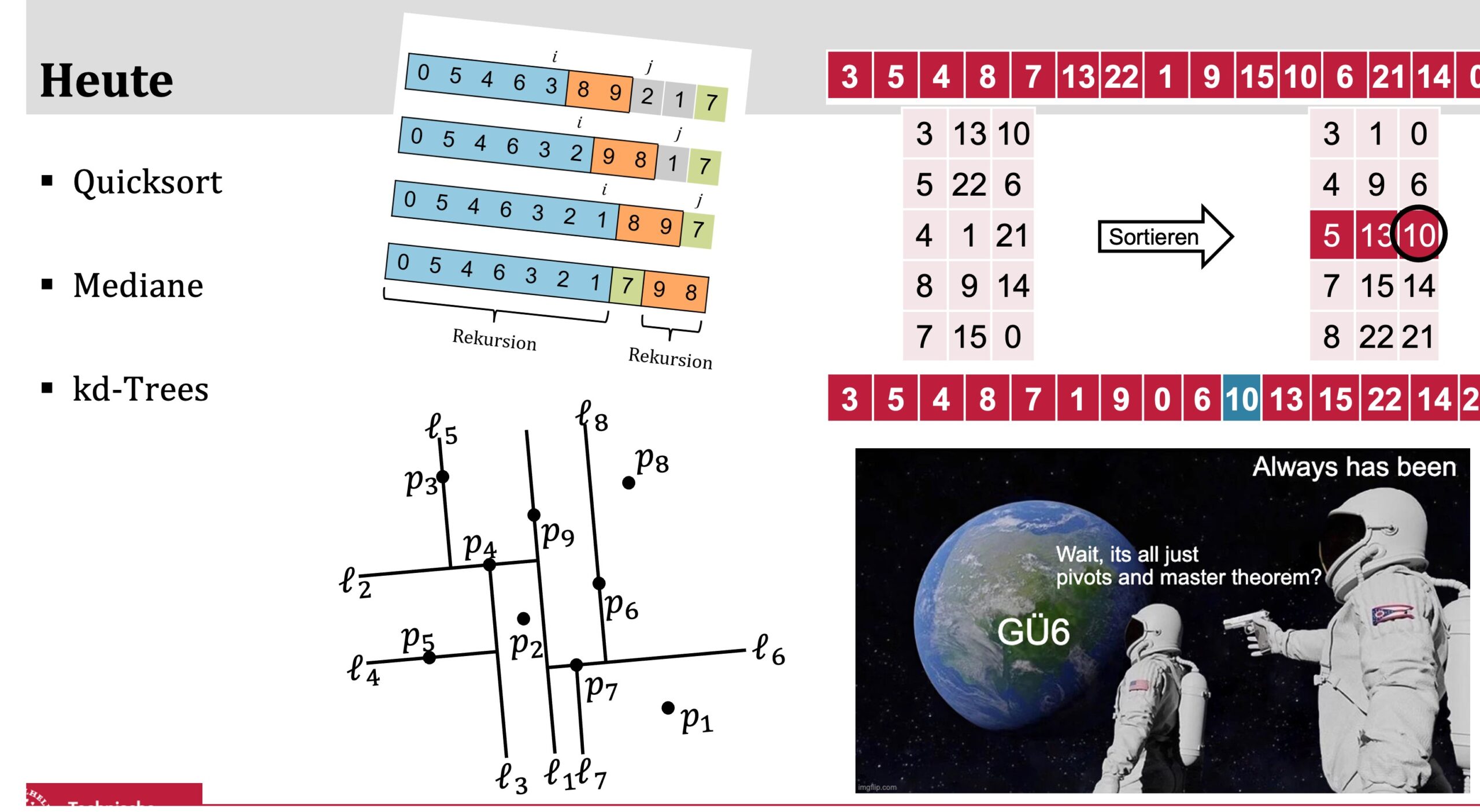 In dieser Übung schauen wir uns noch einmal das Sortierverfahren Quicksort an und sprechen über die Berechnung von Medianen. Außerdem schauen wir uns mit den kd-Bäumen eine spezielle Datenstruktur für mehrdimensionale Daten an.